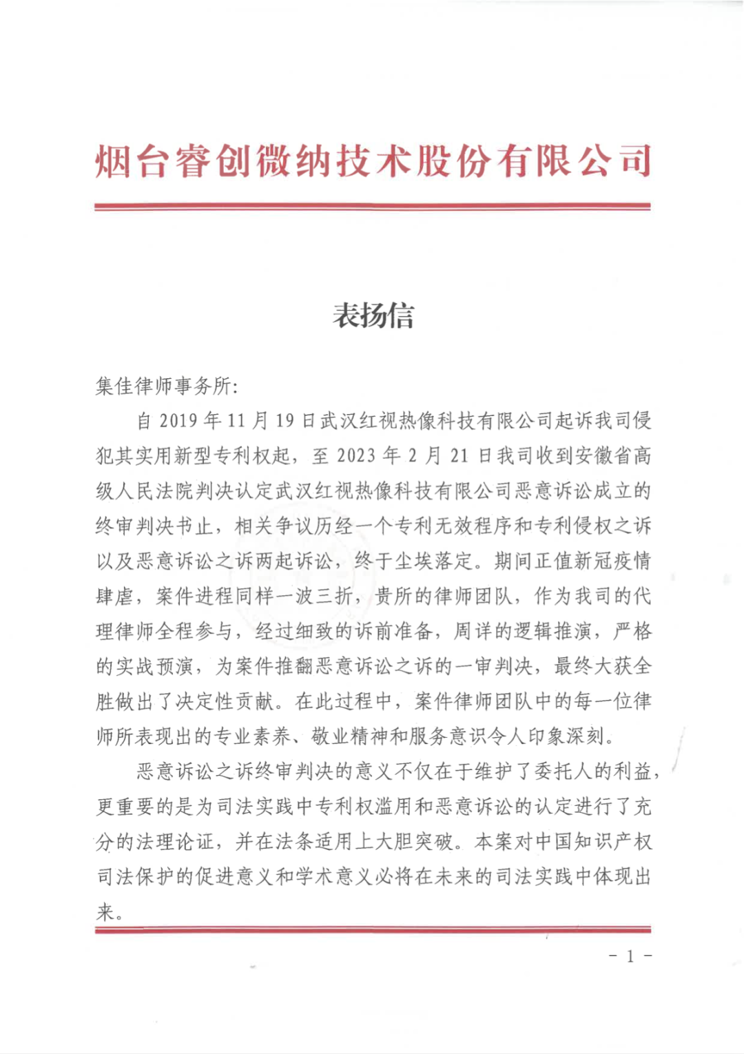 2023年2月10日,安徽省高级人民法院就烟台睿创微纳技术股份有限公司、烟台艾睿光电科技有限公司、安徽英睿系统技术有限公司等(下称“睿创集团”)与武汉红视热像科技有限公司(下称“武汉红视”)因恶意提起知识产权诉讼损害责任纠纷一案作出终审判决,认定武汉红视滥用诉权的行为构成恶意诉讼,并判令其赔偿睿创集团相应的合理支出。至此,时隔四年,横跨疫情时代的专利侵权及恶意诉讼系列纠纷案,终于尘埃落定。raybet协助睿创集团最终取得系列案件的全面胜利,维护了客户合法权益,实现了商业竞争的公平正义!