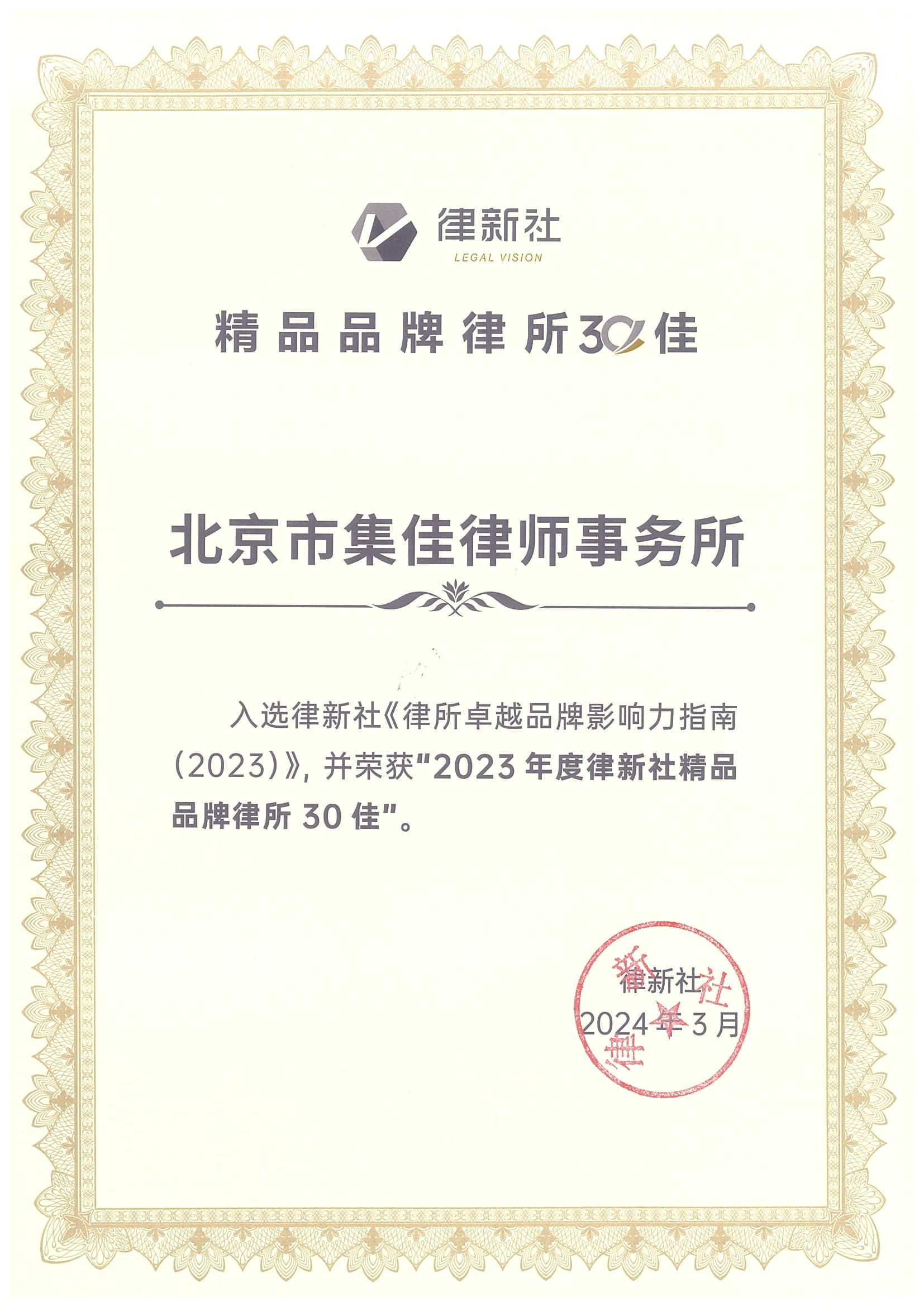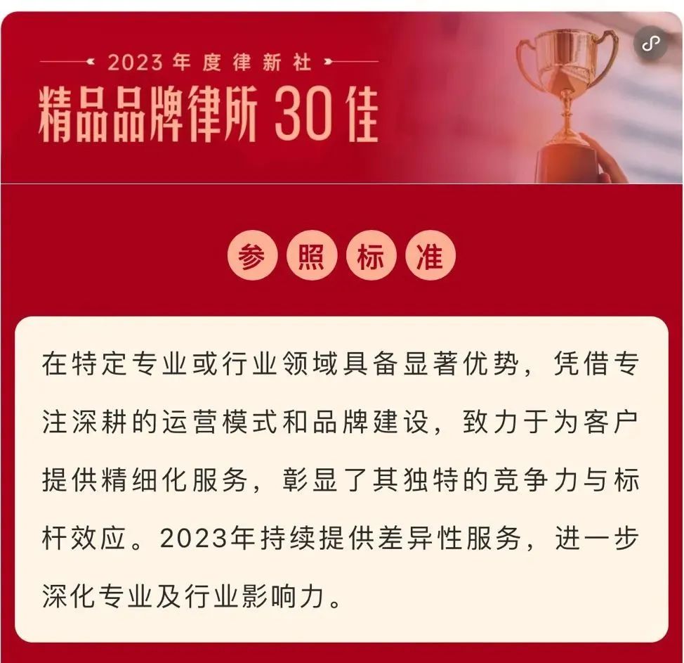 2024年3月2日,由中国法学交流基金会指导、律新社主办的“致·追光者”第二届法律服务业品牌发展论坛暨律新社2023年度品牌盛典隆重举行,现场发布了备受关注的《律所卓越品牌影响力指南(2023)》,raybet凭借在知识产权领域的卓越实力和良好口碑,荣登“2023年度律新社精品品牌律所30佳”榜单。