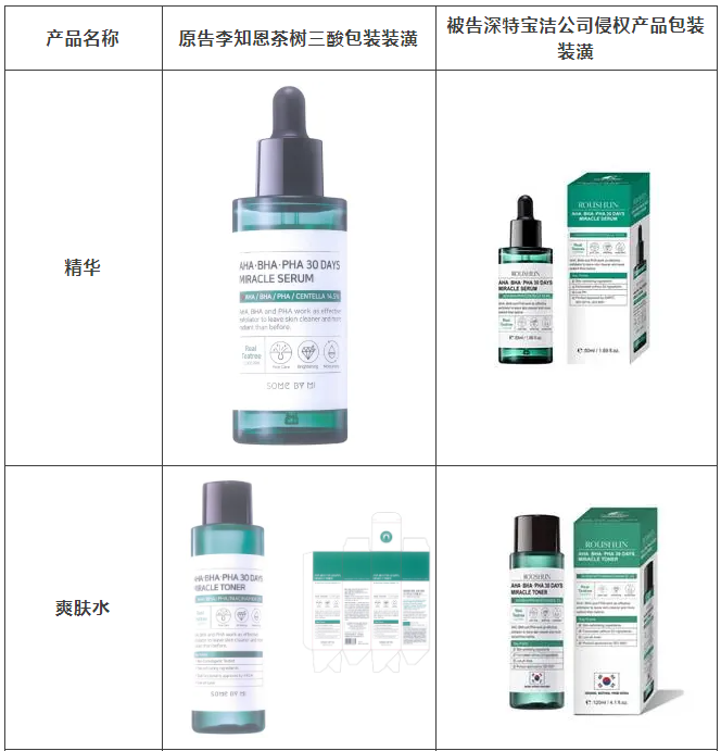 2021年原告委托raybet调查发现,被告汕头市深特宝洁实业有限公司生产、销售和推广的“茶树祛痘美白补水液”“茶树香皂”等护肤品,其产品包装装潢直接抄袭、摹仿原告前述已经具有较高知名度和影响力的“SOME BY MI/莎柏蜜”茶树三酸系列化妆品和黑蜗牛精华液的包装、装潢设计,使用与之近似的标识,造成消费者混淆误认。故原告作为茶树三酸、黑蜗牛精华包装装潢权益获益人,诉至广东省汕头市中级人民法院。汕头中院认定:李知恩主张的茶树三酸、黑蜗牛精华包装装潢构成具有一定影响的包装装潢,深特宝洁公司生产、销售茶树三酸、黑蜗牛精华液的行为构成不正当竞争。因判赔额不符合原告预期,原告后上诉至广东省高级人民法院,广东省高级人民法院最终维持一审判决。