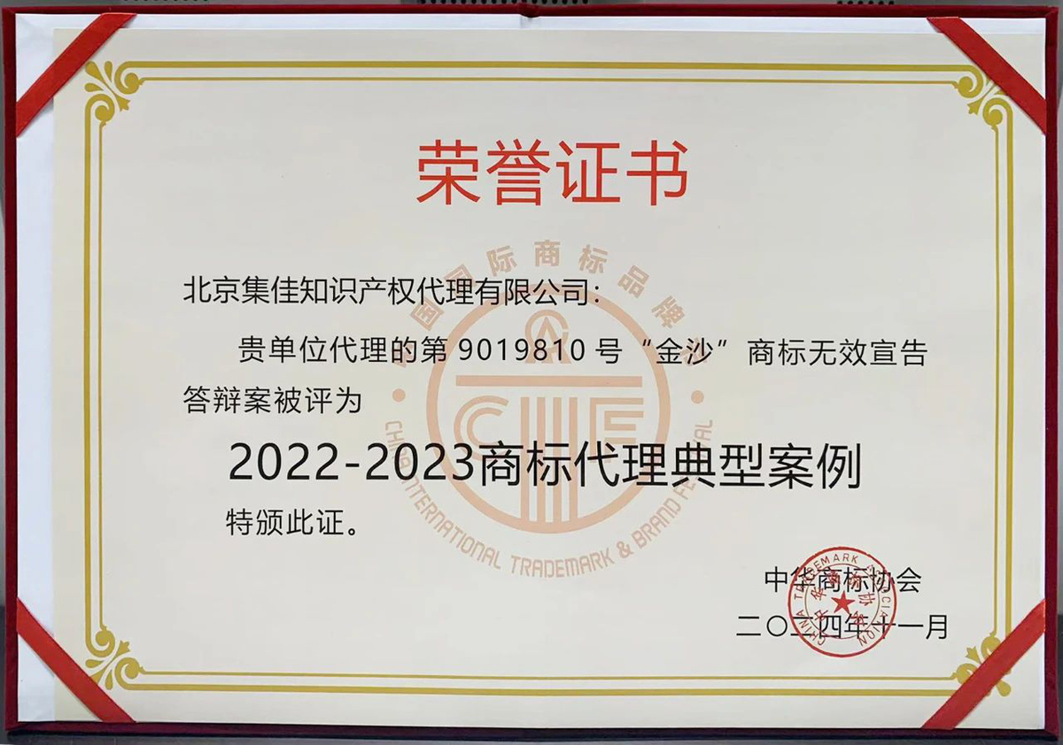 >raybet>关于我们>荣誉概览>2024>集佳代理的“金沙”商标权无效宣告答辩案入选“2022-2023商标代理典型案例”
