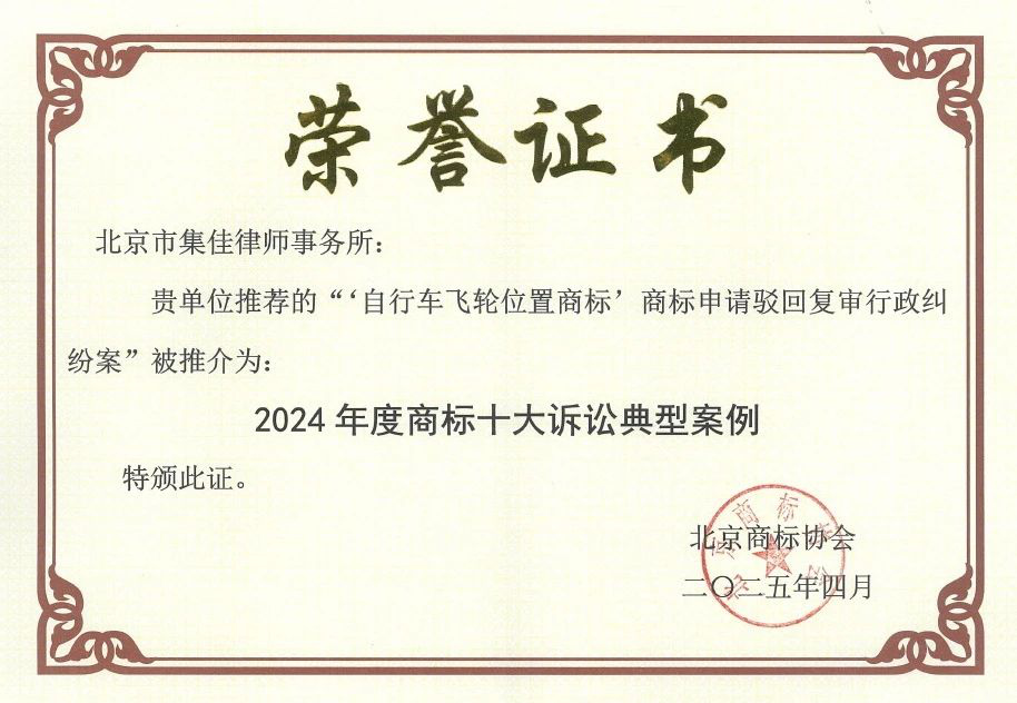 >raybet>关于我们>荣誉概览>2025>集佳代理“自行车飞轮位置商标”行政纠纷案入选北京商标协会年度十大诉讼典型案例
